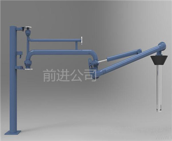 密闭式顶部装卸臂由5个旋转接组成回转**,液相4个,气相1个。气相一般为DN50,液相根据客户需要的流量选择。气相在转接处使用金属软管连接,保证鹤管的旋转灵活性。鹤管液相接口朝下,气相接口朝上,一般气相会多台汇总在一个主管上,如果单台排空的话,需要加带雨帽的阻火器,**管道进入点燃源。垂管上有一个锥形密封帽,装车时垂管插到槽车的顶部灌口,密封帽压实在灌口处,锁紧外臂锁紧杆(或者气缸压紧,在和油气回收配合使用时,建议鹤管增加气缸,达到充分密闭的作用,因为空的槽车在装车时物料逐渐增多,槽车轮胎压扁,槽车降低,密封帽就不能很好的密封了,必须有气缸对密封帽有一个压力,才能使密封帽始终跟紧灌口。达到有效密闭的效果,油气回收需要密闭效果达到90%-95%)密封帽密闭后,槽车里气化的介质就能通过鹤管上的气相管道排空或者抽入油气回收系统